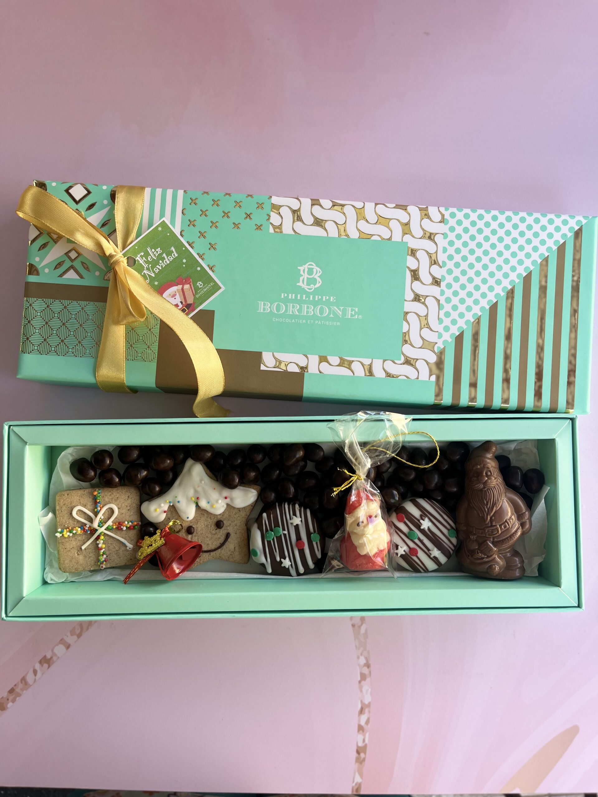 Caja rectangular con maní bañado en chocolate, 2 mini alfajores, un pascuero de chocolate y otro de mazapán, 2 galletas navideñas.