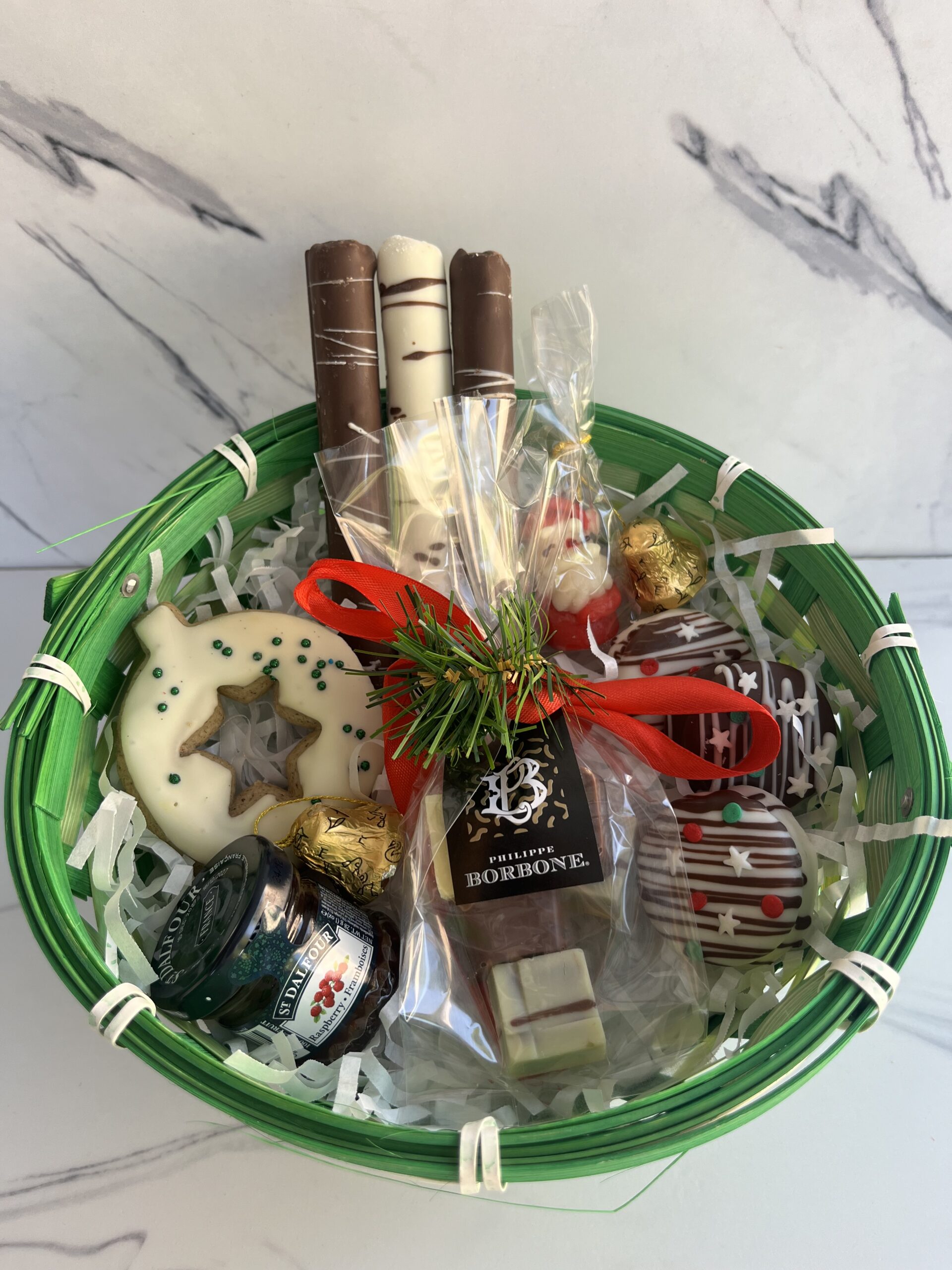Canasto que contiene 3 cuchuflis, bombones, mermelada, mazapán en forma de viejito pascuero, 2 campanitas, 3 mini alfajores, una galleta navideña.